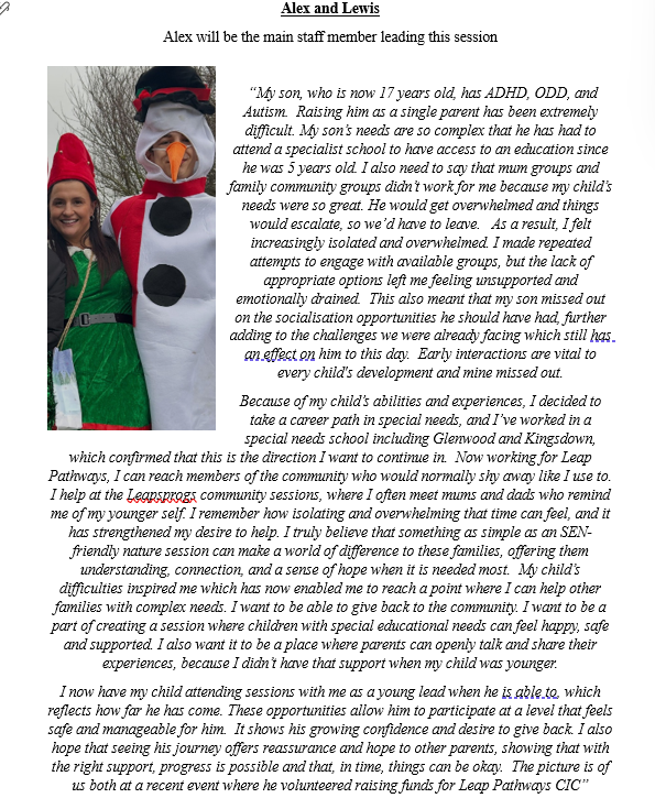 Through our Leapsprogs nature sessions, we provide a safe, welcoming space where children and families can spend time outdoors together, build confidence and feel part of a community.