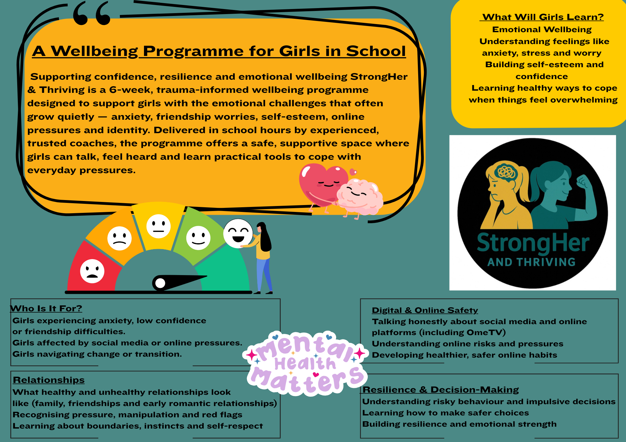 Referrals for counselling are climbing faster than services can respond. Girls wait and a lot never get seen. Meanwhile, anxiety rises, online pressure grows, and confidence falls. The Children’s Society reports wellbeing dropping in girls aged 11–15, the strain is growing, not shrinking.
